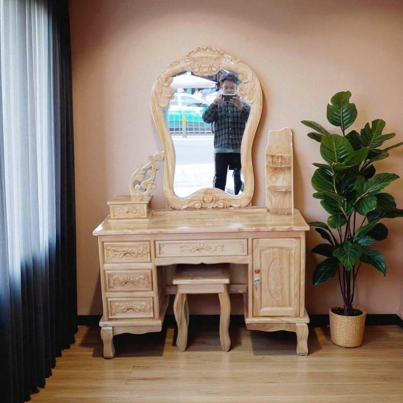 • Gương soi lớn, chạm khắc cầu kỳ: Gương được thiết kế với khung chạm khắc hoa văn tinh xảo, không chỉ giúp bạn dễ dàng trang điểm mà còn là điểm nhấn nghệ thuật cho căn phòng.