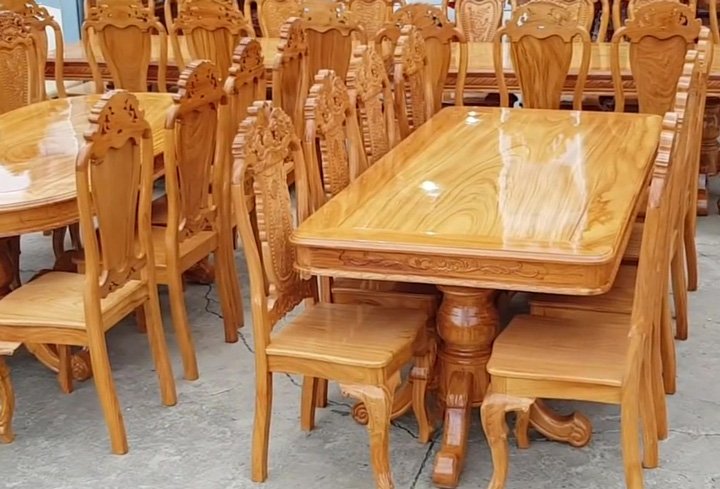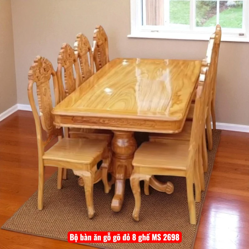 Kích thước bàn ăn: Rộng 1m x Dài 2m, đi kèm 8 ghế gỗ chất lượng cao