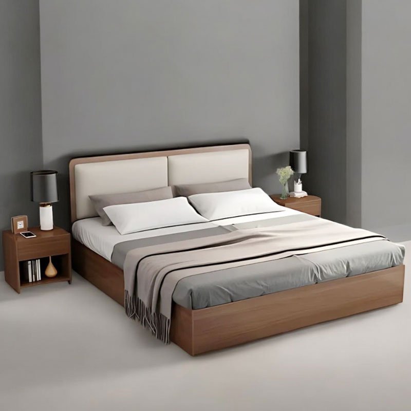 - Tông gỗ nâu sáng kết hợp hoàn hảo với màu xám hoặc trắng của nệm, mang đến sự trang nhã, dễ phối hợp cùng các món nội thất khác như tủ quần áo, bàn trang điểm, hay rèm cửa.