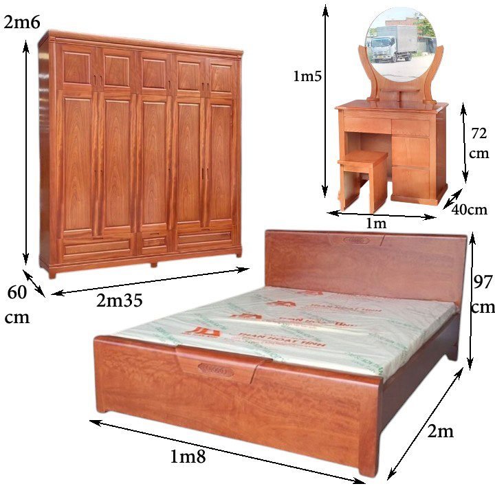Kích thước: Giường 1m8, tủ áo 2m35, bàn phấn 1m