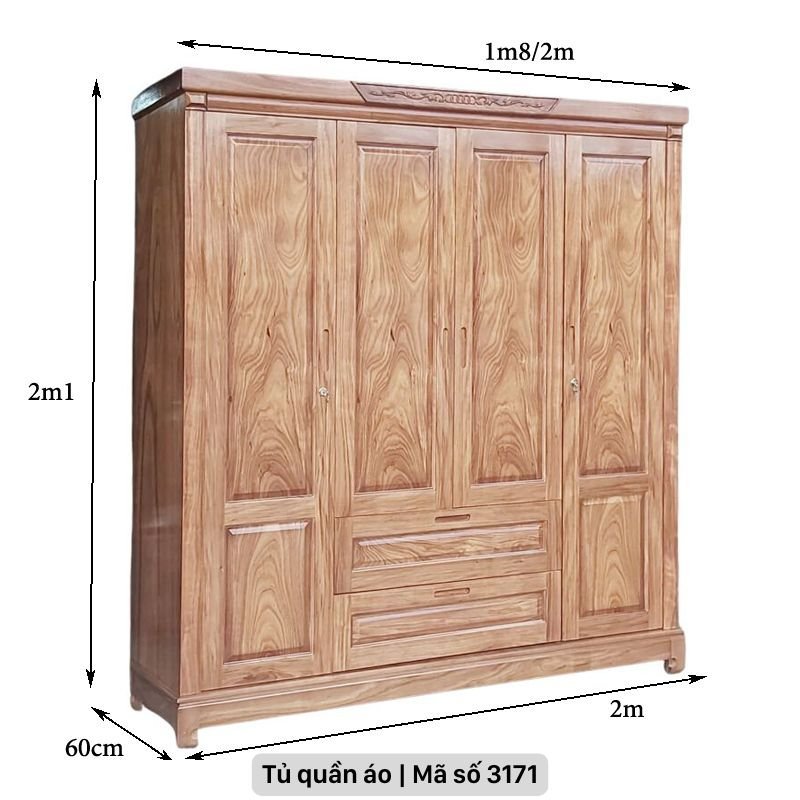 Kích thước là một yếu tố quan trọng khi chọn lựa tủ quần áo. Tủ quần áo gỗ 4 cánh thường có kích thước tiêu chuẩn, vừa đủ để chứa đựng quần áo và phụ kiện của cả gia đình mà không chiếm quá nhiều diện tích. Kích thước tiêu chuẩn thường dao động quanh 2m chiều rộng, 2m chiều cao và 60cm chiều sâu.